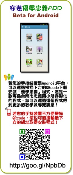 本校專為Android系統之手機及平板電腦開發專屬的App軟體,安裝之後除了用掃瞄QRcode的方法觀賞導覽影片之外,也可以利用App所提供的介面以輸入導覽碼的方法來觀看各景點的影片。非常歡迎您安裝使用「優學忠義」APP,目前APP仍屬於發展階段,其內容會不斷地更新!